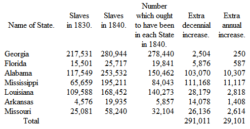 Accordingly, for the fifty years ending in 1840, the slaves increased on an average a little over twenty-eight per cent every ten years. We adopt this as a fair statement of what should be their decennial natural increase in all the States; and, by natural increase, we mean increase from births. The following tables explain themselves: —