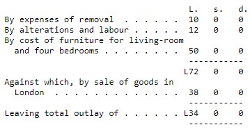 The other rooms in the house required no alteration; fresh whitewash and wall-papers soon transformed them; and although they were small, they were not devoid of charm. When my scheme of adaptation was complete I found myself possessed of a house containing one beautiful living-room, a small library, a kitchen, and four good bedrooms. My bill for labour, including the mason's work in the removal of the partition wall, the building of a new window, and the laying of a fresh hearth; the carpenter's work in fitting my oak, and various minor repairs, amounted in all to about twelve pounds. The cost of my furniture, including the oak panelling in the living-room, and all that was needed for the bedrooms, was about fifty pounds, against which I had to set thirty-eight pounds, received from the sale of my superfluous effects in London. If I added to these sums the general expenses of removal, the carriage and cartage of my goods, and so forth, which I reckoned at ten pounds, I found that the cost of my exodus and new tenancy had been as follows:—