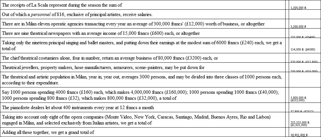 Let us take here the statistics for the city of Milan to better grasp my meaning. The figures are official, and are taken from a report presented to the municipality some time ago, and prove there is a business side of vital importance attached to the proper working of the local subsidised theatre, La Scala. The following are the items of what they call giro d'affari, or, in paraphrase, of "the operatic turn-over," and all are official figures.