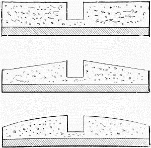 Now comes a question about which there is a difference in the tastes or fancies of entomologists. Shall the boards be perfectly flat on the top, or shall the sides slope from the groove, or shall the surface be rounded? A glance at the three sections of setting boards will show clearly what is meant. The rounded board is most commonly used, and the graceful curve thus given to a butterfly or moth set on such is certainly attractive; but it is not natural. The wings of these insects are rigid, and are never seen bent into such curves in a living specimen. For this reason I much prefer a perfectly plane surface on each side of the groove. Then, as to whether there shall be a slope or not, this is a matter of less importance. A very decided sloping of the wings is certainly not so convenient for future examination; nor does it, to my mind, look nearly so well as both sides in the same plane, or at a very gentle inclination. But perhaps this subject had better be left to the taste of the reader, remembering, however, that, whatever plan be adopted, all the boards should be alike in this respect, so that there may be a degree of uniformity in the cabinet.