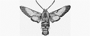 The former is illustrated in the woodcut appended. The fore wings are transparent like those of bees, with a dark central spot and a broad reddish-brown hind margin. The base and costa are black and tinged with green. The hind wings are similarly coloured, but have no central spot. The body is olive-brown, with a broad reddish belt, and behind are tufts of hair, which are spread out when the insect flies, just after the manner of the tail feathers of a bird. The moth flies in May.