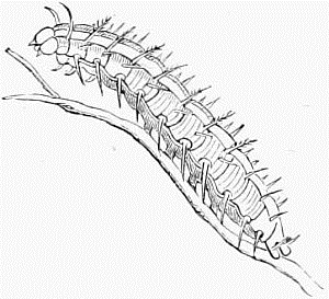 Take a caterpillar from your garden, preferably a full-grown one of a rather large species, that is not very densely covered with hair, and examine it carefully as we note the main points in its structure. The first point that strikes our notice is the division of its body into segments or rings, separated from each other by a more or less distinct line or slight constriction of the body.