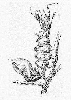 Many species, when at rest, fix themselves by means of their claspers to a small twig or leaf stalk, or on the midrib of the leaf itself. Here they remain perfectly still, with their bodies perfectly straight or with head slightly raised. I need hardly say that these generally fix themselves on the under side of the leaves and stalks, thus securing themselves against the attacks of the feathered foes above. But some birds are equal to the caterpillars in this matter; and it is really amusing to see them hopping about beneath the leaves in our gardens, every now and again slyly turning one eye upward, and smartly plucking an unwary grub from its resting place.