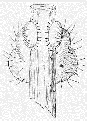 We will now leave the caterpillar for a moment while we look at its cast-off clothes. They are still clinging to a stem so firmly that they can scarcely be removed without injury. The hard shell that covered the head and jaws is perfect in form, and so are the claws and cases of the legs. All the hairs or spines that happened to adorn the previous owner still retain their positions; and the whole skin, although always more or less shrivelled, is sometimes so slightly altered in form that it might be mistaken for a living caterpillar if not closely examined.