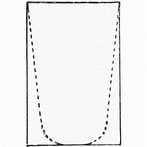 The material usually employed in making the 'bag' is called leno. It can be purchased at most of the drapers' shops, and three colours – white, yellow and green – are usually kept in stock. Measure the circumference of your net frame, and see that you get sufficient leno to make a good full net. Suppose, for instance, that the circle of your frame measures thirty-six inches round, then your leno should be at least forty inches in length. Fold this double, and then cut out two pieces of the shape shown in fig. 42, letting the depth of the net be nearly or quite equal to the width of the material. There is nothing to be done now but to stitch the bag together and sew it to the calico on the ring.