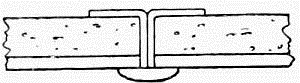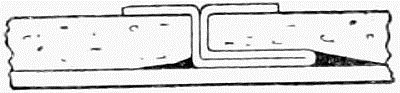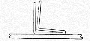 First. – Cut a few little strips of sheet tin, each about two inches long and one-eighth wide. Double and bend them as shown in fig. 46, and solder them to the surfaces which the cork is to cover (fig. 47). As the cork is pushed in its place, these little slips are allowed to force themselves through slits in it made by means of a penknife, and then the ends are bent over as shown in fig. 48. Two or three such fasteners will be quite sufficient to hold down each sheet of cork.