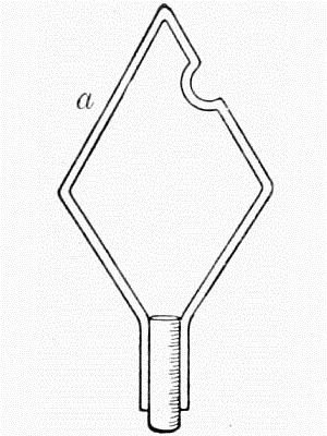 If you reside on the outskirts of a town an occasional tour of inspection of street lamps may add a few specimens to your collection, and some entomologists attach so much importance to the value of these luminaries that they provide themselves with a special net for the removal of moths from the glass and rails (fig. 50). The straight side marked a is applied to the panes of glass when flutterers or settlers are to be taken, and the bend on the opposite side is to secure those that rest on the rail. Such a frame is easily made by bending a piece of stout wire to the required shape, and then soldering it to a ferrule to receive a long stick. The net itself should not be deep.