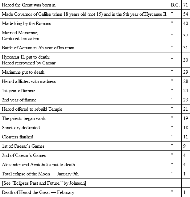 The dates here given are the result of a geometric plotting of the facts given in the works of Flavius Josephus: – see chart with this volume.