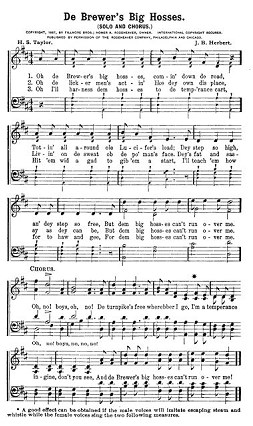 DE BREWER'S BIG HOSSES.AOh, de Brewer's big hosses, comin' down de road,Totin' all around ole Lucifer's load;Dey step so high, an' dey step so free,But dem big hosses can't run over me.ChorusOh, no! boys, oh, no!De turnpike's free wherebber I go,I'm a temperance ingine, don't you see,And de Brewer's big hosses can't run over me.Oh, de licker men's actin' like dey own dis place,Livin' on de sweat ob de po' man's face,Dey's fat and sassy as dey can be,But dem big hosses can't run over me. – Cho.Oh, I'll harness dem hosses to de temp'rance cart,Hit 'em wid a gad to gib 'em a start,I'll teach 'em how for to haw and gee,For dem big hosses can't run over me. – Cho.
