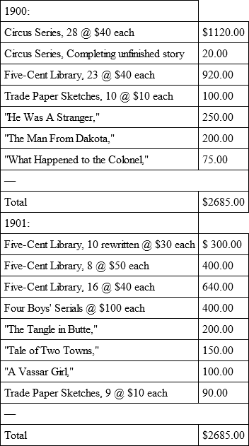 On Aug. 5 the length of the Five-Cent Library stories was cut from 30,000 words to 20,000, and the remuneration was cut from $50 to $40. Another juvenile paper was started and Edwards was asked to submit serials for it. In fact, 1901 might be called a "boom" year for the Fiction Factory, although the returns, while satisfactory, were not of the "boom" variety.