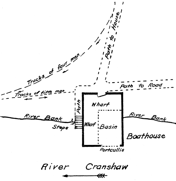 A careful search of the ground near the boathouse revealed occasional impressions on the closely cut sward. The Inspector spent over an hour moving from point to point, and was at last satisfied as to what had taken place. The four men whom he had assumed were Austin and the servants, had evidently come down the path from the direction of the house. They had turned to the right before reaching the boathouse, thus approaching the river diagonally, and had crossed the paling bounding the lawn close to the water’s edge. These men had walked together and the tracks were exactly in accordance with the statement of their movements they had made to the sergeant.