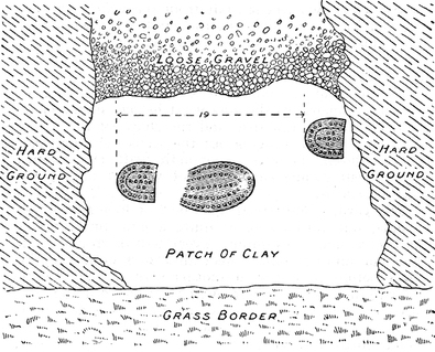I have said two, but that is not strictly correct. One, that of a workman’s right boot with heavy hobnails, was complete in every detail, the clay holding the impression like plaster of Paris. The other, some distance in front and to the left and apparently the next step forward, was on the edge of the clay patch and showed the heel only, the sole having borne on the hard.
