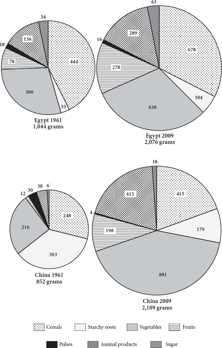 A changing plate of food in China and Egypt in 1961 and 2009.