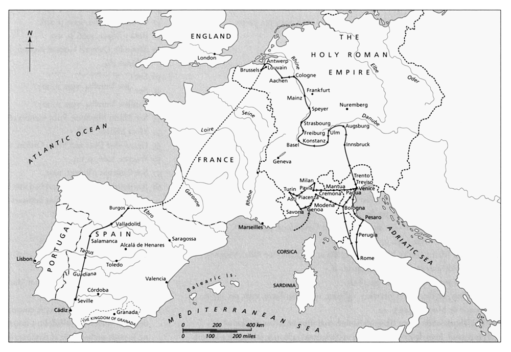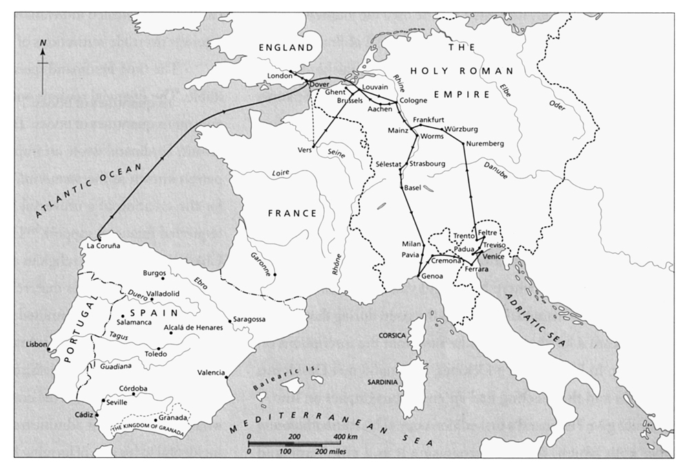 The route of Hernando’s journey through Europe in 1529–31; the dashed portions are conjectured.