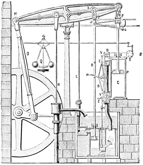 A cross section of a late eighteenth-century Boulton and Watt steam engine. The main cylinder, C, would have been bored by John Wilkinson, the piston, P, fitting snugly inside it to the thickness of an English shilling, a tenth of an inch.