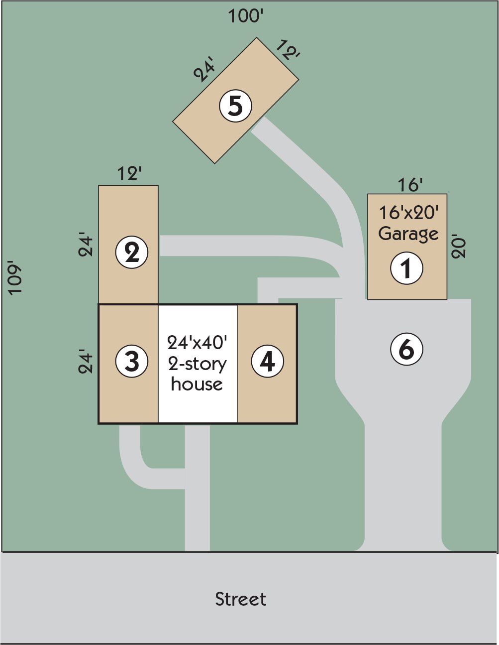 ① A single-car 16’ × 20’, 1-story garage makes a perfect, groundfloor accessible apartment.