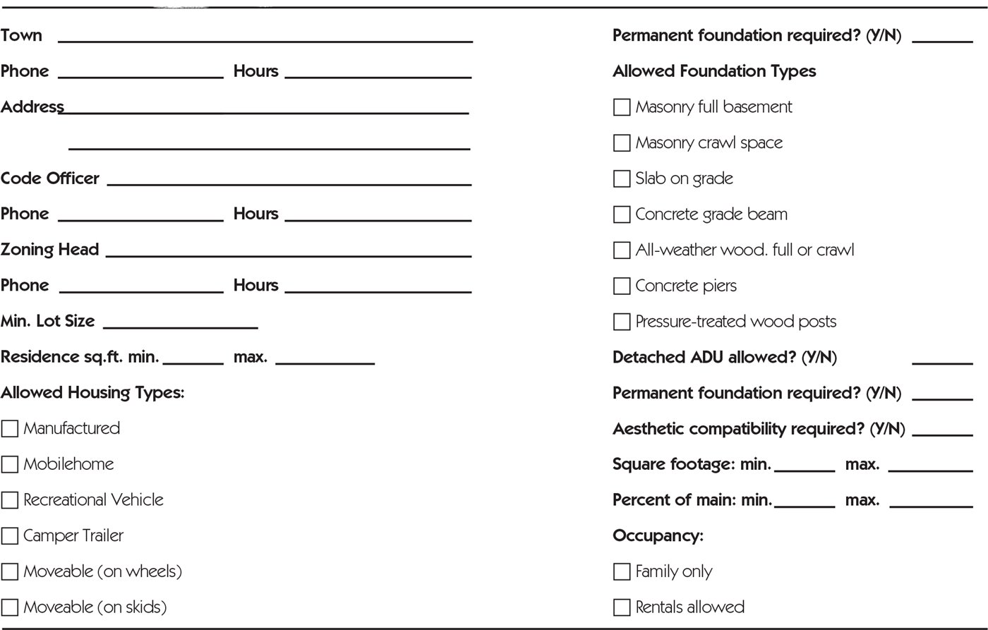 Your first meeting will be for gathering information prior to purchasing land and drawing plans. Once you feel the official is engaged and at least somewhat encouraging, ask if they could help by supplying the answers to a list of specific zoning questions. Assuming the answer is yes, complete a copy of the survey form on the facing page.