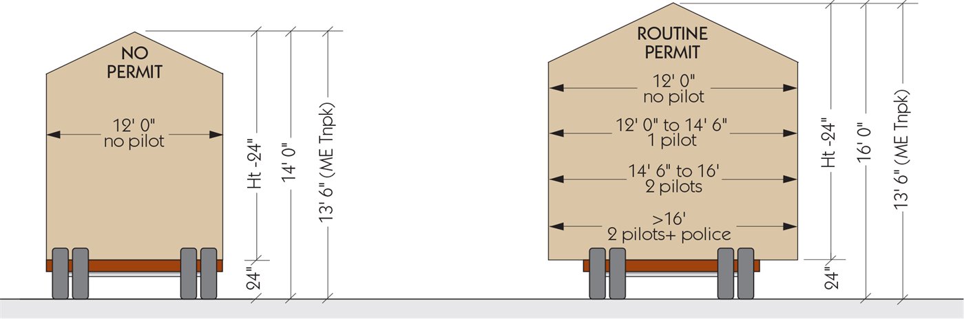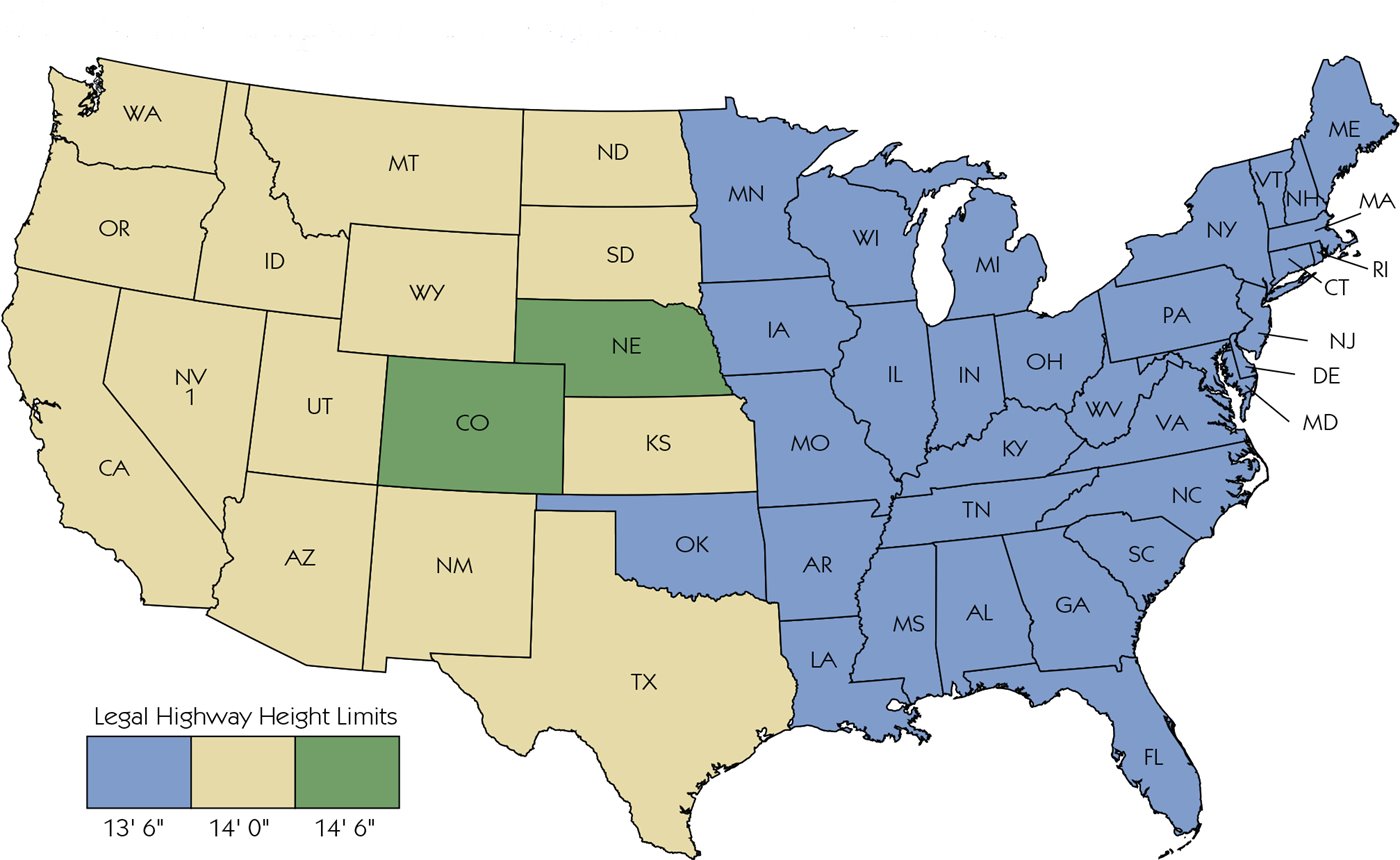 As shown on the map and in the illustrations below, there is good reason tiny homes on wheels are limited to 13’ 6” in height and 8’ 6” in width. However, with state-issued permits, much larger tiny homes on skids can be transported from point of assembly to building site. Low clearances, restricted routes, and state permitting agency phone numbers and websites are all listed in the Rand McNally Deluxe Motor Carrier’s Road Atlas (available on Amazon).