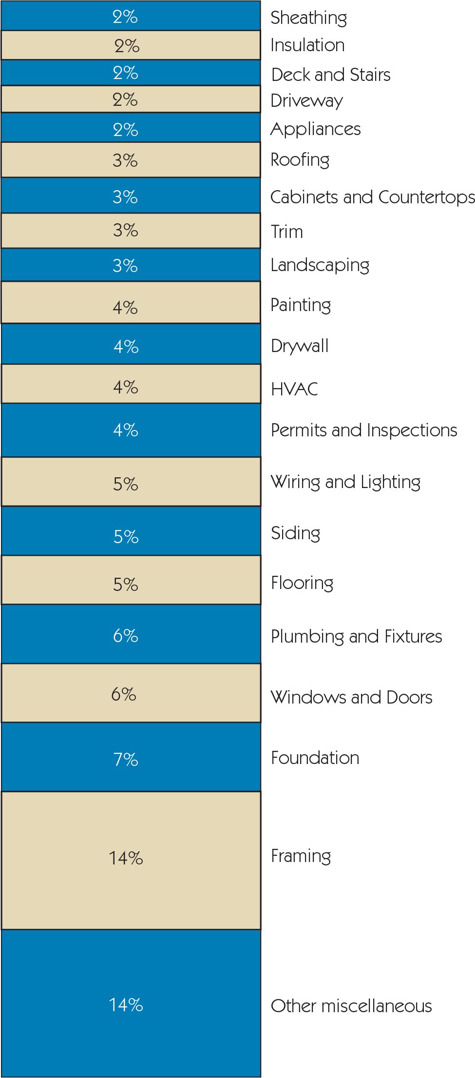 To get dollar costs for each item, multiply the percentages shown by the average total cost of the homes in the survey, $289,000.