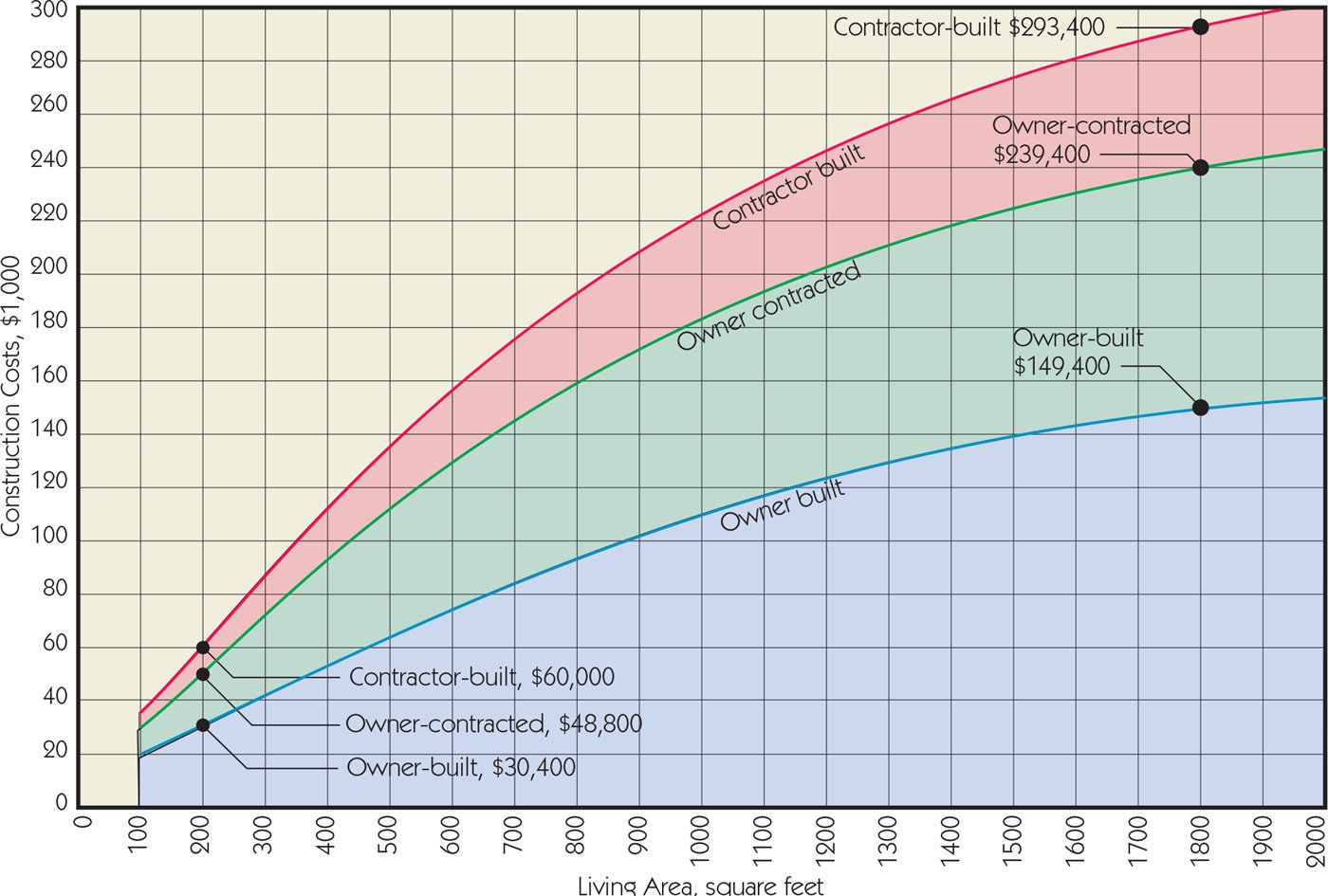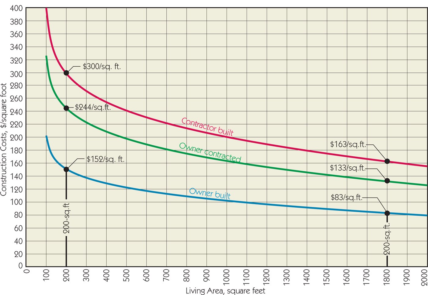 The magnitude of the differences is seen in the two examples shown. The average contracted 200-sq.ft. house costs $300 per sq.ft., while the 1,800-sq.ft. home costs about half as much per sq.ft., $163.