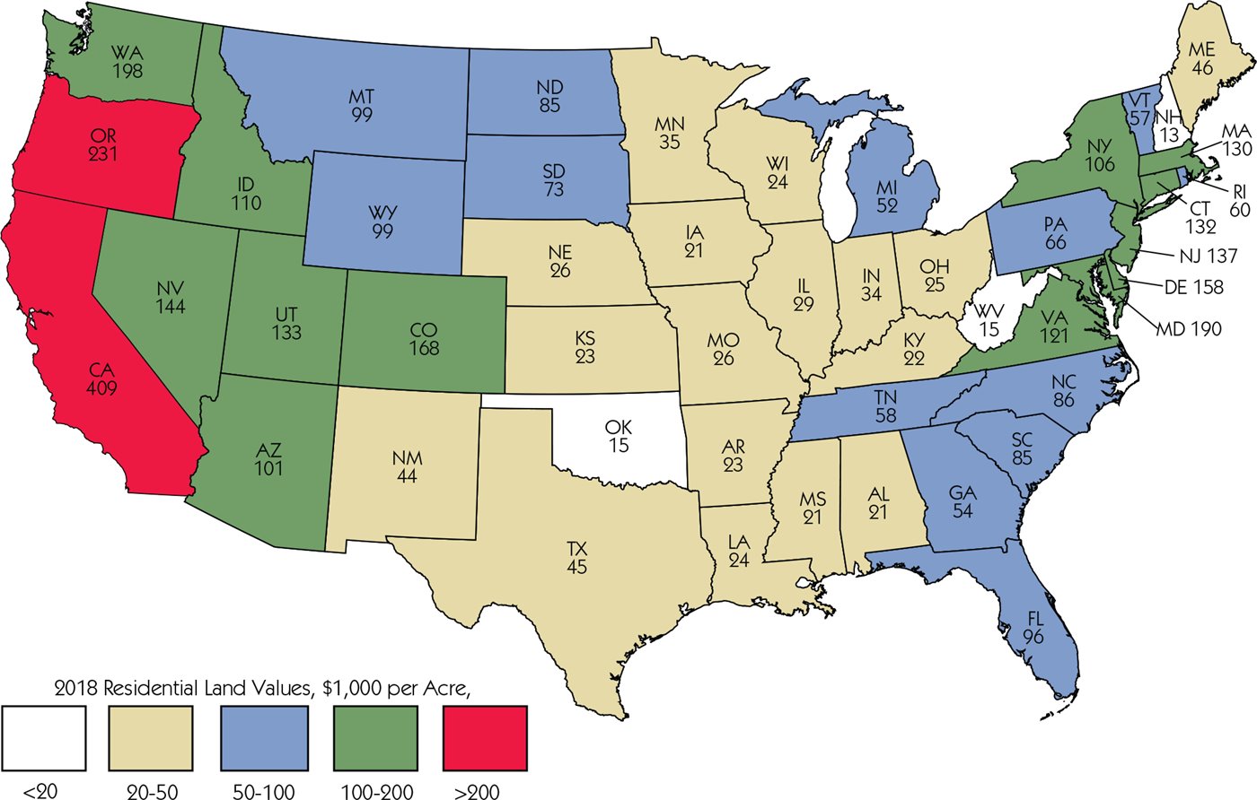 The map below displays the extraordinary range of prices of land in dollars per acre, from about $15,000 in rural areas such as New Hampshire, West Virginia, and Oklahoma, to over $400,000 in sunny California.