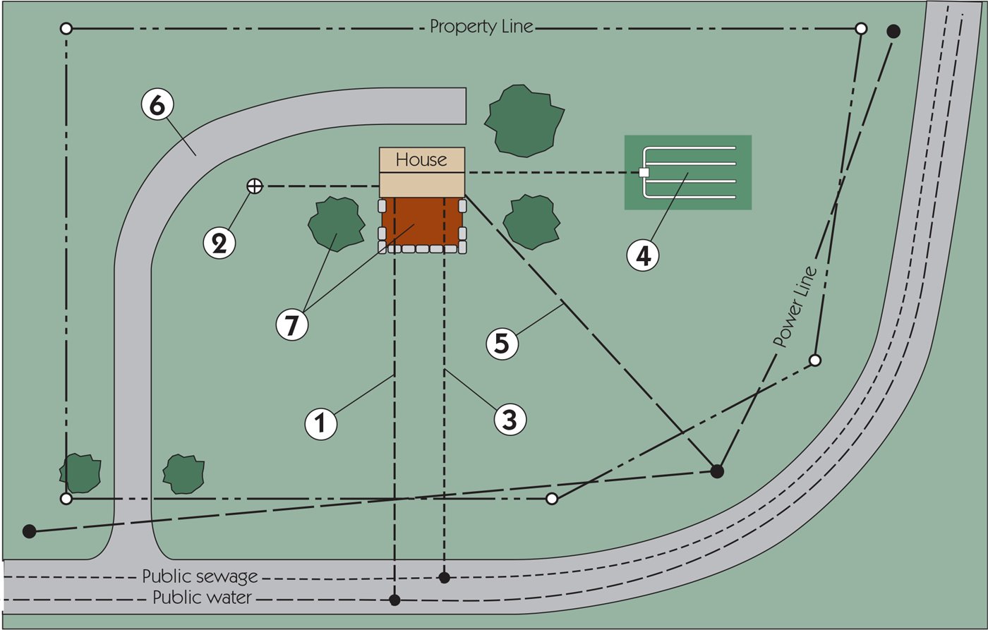 Site services are all those things added to a lot to make the building/lot combination habitable. If the lot is in a development it may already have most or all services already. If not, here are the things you may have to add (see illustration below):