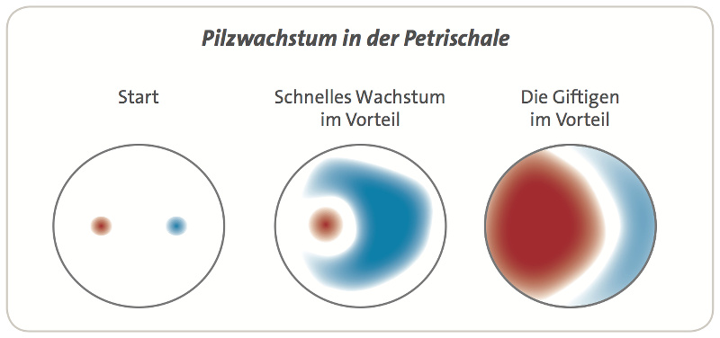 Bild 1: Dynamik durch Enge Zunächst sind die schnellwachsenden Pilze im Vorteil. Sie füllen den leeren Raum. Sobald es aber eng wird, sind die giftigen Pilze (rot) im Vorteil.