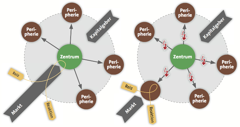 Früher, in träger Umgebung, konnte das Zentrum auch die Anforderungen des Marktes bearbeiten. Die Peripherie reagierte darauf nur indirekt über das steuernde Zentrum. Heute, bei hoher Dynamik, bleibt weniger Zeit, Probleme der Wertschöpfung zu lösen. Sie müssen ohne Umwege dort gelöst werden, wo sie entstehen - in der Peripherie. Da das Zentrum nicht mehr beteiligt ist, verliert es seine operative Kompetenz. Jetzt kann es kaum noch nützliche Anweisungen geben. Wir sagen: Durch die Dynamik kollabiert die Steuerung.