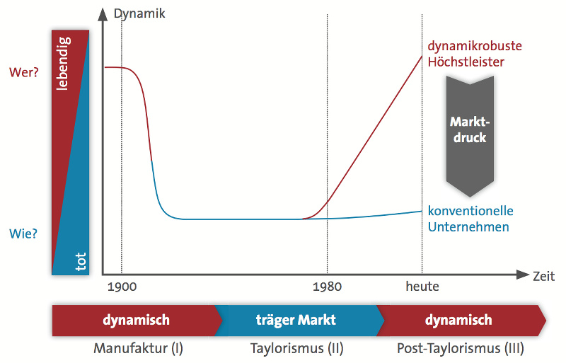 ( II ) Besonders durch technische Innovation reduzieren sich schließlich Tausch- und Transport-Kosten. Neue große Massenmärkte mit hoher Kaufkraft breiten sich schnell aus. Der Konkurrent stört kaum, und wenn, kann man ihm ausweichen. Die Märkte werden weit und träge. Die Kreativität der Unternehmen wendet sich nach innen, auf Produkte, Prozesse und Kosten. Die kundenorientierte Flexibilität der Manufaktur ist jetzt nutzlos. Frederick Taylor entwickelt den theoretischen Hintergrund für eine Wertschöpfung, die zu den neuen Märkten passt, den sogenannten Taylorismus. Nicht mehr das Können der Werker (Wer?) ist die Basis, sondern die Wissenschaft (Wie?). Henry Ford ist einer der ersten, der dies spektakulär nutzt. Die neue Produktion ist dynamikempfindlich, was in den trägen Märkten aber nicht auffällt. Die industrielle Produktivität steigt auf das Hundertfache in nur zwei Generationen.