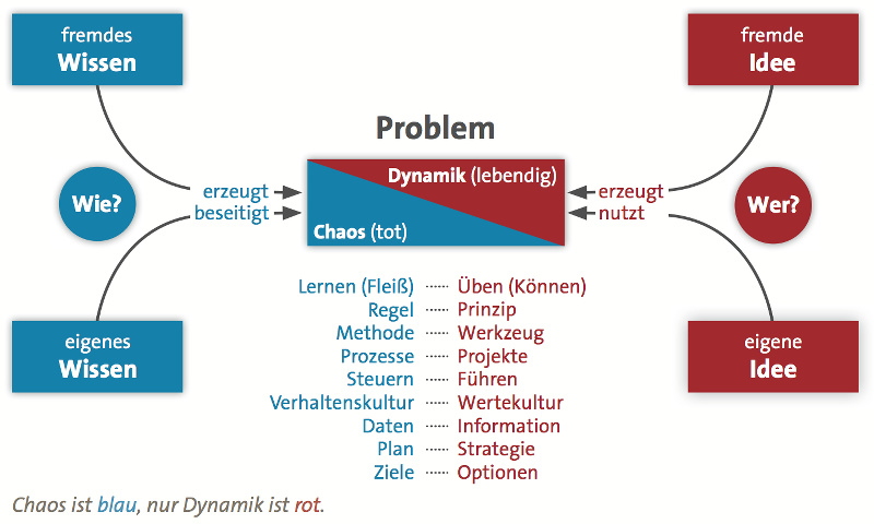 Weil als Nächstes ein Denkzettel folgt, bietet es sich hier an, ihren Gebrauch zu erklären. Die Unterscheidung zwischen Rot und Blau führt zu einer weiteren: der Unterscheidung zwischen Dynamik und Chaos. Beides ist eine Form von Durcheinander, das zunächst gleich aussieht. Wer die Unterscheidung zwischen rot und blau benutzt, kann sehen, dass das Durcheinander aus sehr unterschiedlichen Gründen entsteht: einmal, weil Wissen fehlt, und einmal, weil Ideen lästig werden. Damit diese ungewohnte Unterscheidung im Denken präsent bleibt, kann man beim Probleme lösen gelegentlich auf diesen Denkzettel schauen.