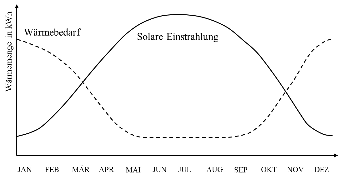 Der Wärmebedarf in Deutschland hat einen Anteil von über 50 % am Endenergieverbrauch.7 Der Anteil von regenerativen Energieträgern bei der Wärmeerzeugung ist jedoch gering. Im Jahr 2016 stammten nur etwa 0,5 % der Nettowärmeerzeugung8 aus regenerativen Energieträgern.9 Der Anteil an erneuerbaren Energien für den Endenergieverbrauch bei Wärme beträgt circa 13 %, jedoch stagniert dieser Wert seit mehreren Jahren.10 Beim Einsatz von erneuerbaren Energien lassen sich sektorenübergreifende Probleme identifizieren. Die starke Volatilität dieser Energieträger erschwert eine versorgungssichere Wärmebereitstellung.11 Diese Problematik wird in Abbildung 1-1 in Bezug auf solare Energie verdeutlicht. Der Wärmebedarf in Gebäuden ist im Winter, während der Heizperiode, am größten. Die solare Einstrahlung und damit die solarthermischen Wärmegewinne sind jedoch im Sommer maximal.