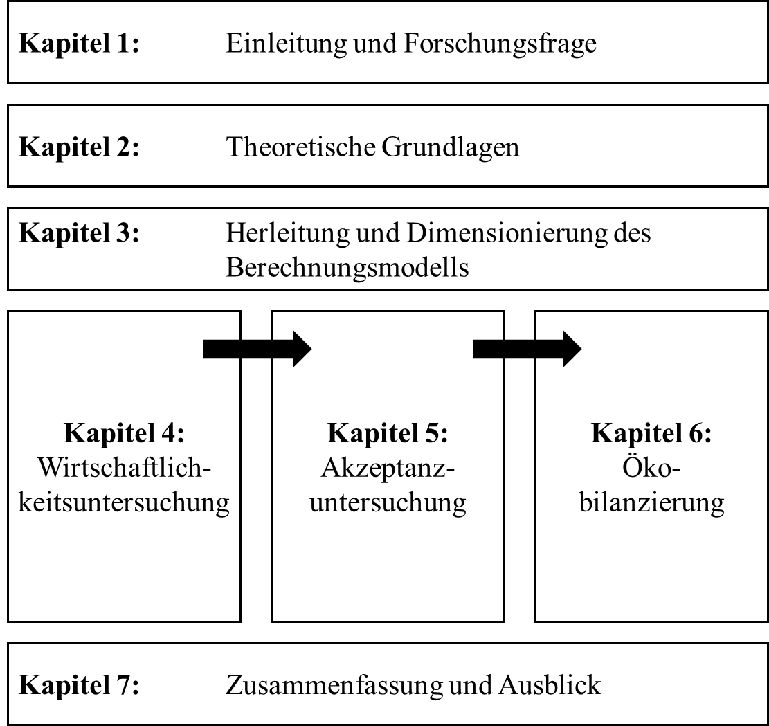 Die Forschungsfrage der Arbeit, die ganzheitliche Bewertung eines nachhaltigen Wärmeversorgungssystems mit einem saisonalen Wärmespeicher, wird in sieben Kapiteln bearbeitet. Der Forschungsablauf kann in Abbildung 1-2 nachvollzogen werden.
