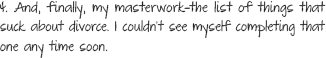 ‘Well,’ she jumped in, ‘I read in this book that the best way through a big life change is to have a list. A to-do list.’