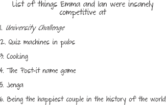 In the background, an episode of University Challenge was playing, which they were watching so they could keep score on the whiteboard they used every week. On one side it said ‘overprivileged students’ and on the other ‘Emsie and Ian’. They were also hosting me to death. ‘Drink?’ asked Ian, going back to the kitchen. ‘Beer? Wine? Vodka? Meths?’