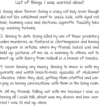 I’d thought my life was going to be all Volvos and trips to Sainsbury’s, dogs and mortgages and maybe babies in a few years. My friend from yoga suggested I think positively about all the things I could achieve now I was ‘on a different life path’—Buddhists are always saying things like this. For example, I’d always wanted to try lots of hobbies. Languages, maybe. Kick-boxing. That looked like fun and would come in handy with all the awful men I’d probably have to date now I was single. Oh God. Dating.