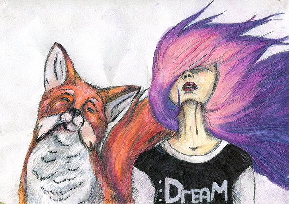 Девочка держала в руках букет из зеленых листьев, сорванных с деревьев в лесу, и смотрела в небо. Ее волосы неестественного цвета лежали на траве, и друг-лис с укоризной поглядывал на них.