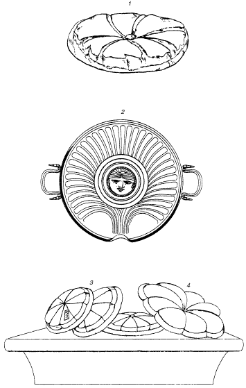 Каппадокийский хлеб: 1 – в Геркулануме были обнаружены два целых каравая хлеба одинакового размера 13,5 дюйма в диаметре 3,5 дюйма толщиной. На обоих сверху было сделано восемь насечек, то есть впервые обозначен крест. Между ними были сделаны и другие насечки. Некоторые части отмечены оттисками; 2 – в Помпеях, в магазине поблизости от Пантеона, были найдены бронзовые формы для выпечки хлеба; 3 – каппадокийский хлеб, испеченный в форме, найденной в Помпеях; 4 – форма для выпечки