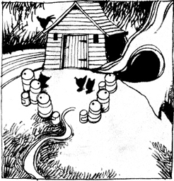 The next morning, Frank and Jess were in the potting shed discussing what to do about Biddy. While they talked, Jess carefully wrote out a very elaborate curly notice, which was to read: CLOSED FOR GOOD. She had so far only got to FOR, and neither of them could think what to do to Biddy.