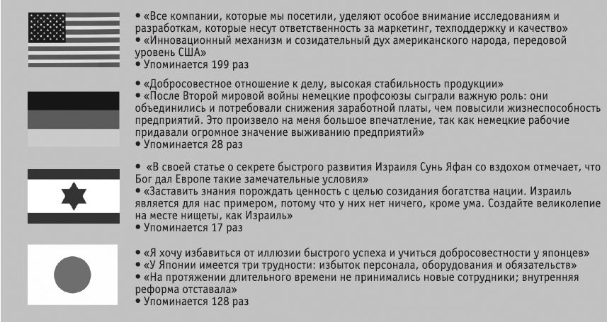 Жэнь Чжэнфэй в процессе руководства развитием предприятия в первую очередь стал образцом обучения. Его область обучения охватывает историю и культуру, уделяя особое внимание изучению и переосмыслению военной стратегии, прецедентов неудач и корпоративного духа. Каждый раз, когда Жэнь Чжэнфэй приезжает в другую страну, он старается извлечь как можно больше уроков и опыта из успехов и неудач данной страны и предприятий. Генеральный директор отразил свои размышления в статье и разослал её всем сотрудникам, связывая эти размышления с будущим компании: с одной стороны, напоминая им об обучении духу новаторства и мастеровитости других стран; а с другой стороны, избегая повторения ошибок других обанкротившихся корпораций. Такого рода дух обучения служит отличным примером для всех сотрудников. На рис. 3.2 мы посчитали количество упоминаний Жэнь Чжэнфэя в своих выступлениях о других странах, и какие полезные вещи Huawei может вынести для себя из предприятий этих стран.