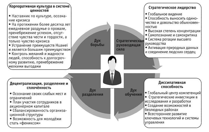 На рис. 3.3 автор выделяет некоторые ключевые особенности лидеров Huawei, которые проявляются в четырёх основных аспектах: первый внимание осознанию кризиса, самоинтроспекции и долгосрочной упорной борьбе в корпоративной культуре и ценностях; второй особое внимание глобальному видению и промышленной структура в стратегической руководящей силе; третий объединение всевозможных сил для совместной работы и интеграция ключевых сотрудников с целями предприятия путём разделения права долевой собственности для формирования огромного содружества в аспектах децентрализации, разделения и единения; четвёртый акцент на создании основных способностей предприятия, внедрении лучших мировых практик для «укрепления здоровья» и создании ключевых компетенций в безлюдных районах в процессе наращивания диссипативных способностей.