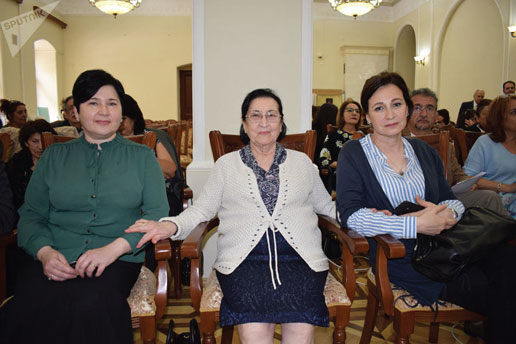 В центре Камила Абдуллаева (праправнучка генерала Араблинского, дочь Сафии и внучка Сары Тагиевой,), слева – Инесса Керимова, справа – Дилара Аллахвердиева (дочери Камилы Абдуллаевой), Баку, 2019 г., конференция, посвященная 120-ти летию Сары Тагиевой