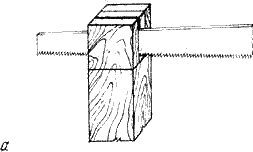 Проделывание проушины начните так же, как и при нарезко шипов, с боковых запилов, ставя пилу рядом с риской, но не снаружи, а внутри самой проушины (рис. 19, а). При несоблюдении этого условия проушина получится шире, чем нужно, и шип в ней не удержится.