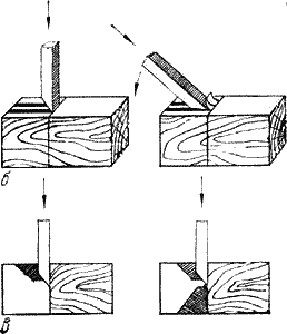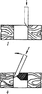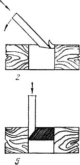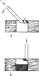 Начиная долбление, поставьте долото вертикально скошенной гранью (фаской) в сторону проушины рядом с риской, ограничивающей проушину по длине (рис. 19, б). Поскольку долото при начальной врубке немного сминает древесину, ставить его нужно, отступя приблизительно на 1 мм от риски внутрь проушины. Удерживая долото левой рукой, слегка ударьте по нему киянкой. Долото перережет волокна, немного углубится в древесину и сдвинется вплотную к риске. После этого отодвиньте долото на небольшое расстояние внутрь проушины, отклоните от себя на угол приблизительно 45° и вновь слегка ударьте по нему – отделится первая стружка. Поставьте долото вертикально на прежнее место у риски и нанесите следующий удар, на этот раз сильнее, чем прежде. Долото еще глубже врубится в древесину. Снова отставьте его от себя, по дальше, чем в первый раз, так же наклоните и очередным ударом отколите вторую стружку.