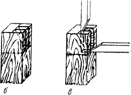 Так, чередуя удары для углубления с ударами для скалывания стружки и с каждым разом усиливая удары и отодвигая долото все дальше от риски, врубитесь на глубину, равную половине ширины бруска. После этого переверните брусок и долбите проушину с противоположной стороны до тех пор, пока подрубленный с обеих сторон остаток древесины не вылетит из проушины (рис. 19, в).
