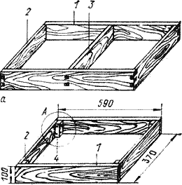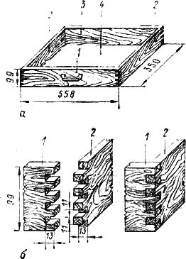 Рис. 22. Ящик (а) и ящичная вязке (б): 1 – передняя стенка; 2 – боковая стенка; 3 – задняя стенка; 4 – дно