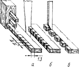 Кроме поперечного распиливания, о котором шла речь, в некоторых случаях приходится производить продольное распиливание доски на заготовки меньшей ширины. Продольное распиливание досок, в общем, не отличается от распиливания плиты, только пилить нужно, не отступая or разметочной риски, а вплотную к ней или даже прямо по ней. Распиливаемую доску можно закрепить в тисках вертикально (рис. 15, в). Если пилу зажимает в пропиле, вставьте в него небольшой клинышек – щепку.