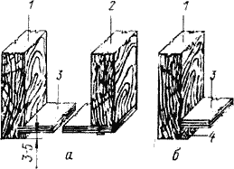 Рис. 24. Крепление дна ящика к стенкам: а – с отборкой пазов; б – без пазов; 1 – передняя стенка; 2 – задняя стенка; 3 – дно; 4 – крепежная планка