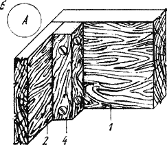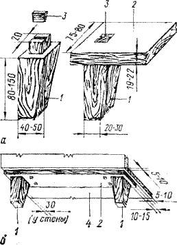 Рис. 26. Ножки: а – соединение ножки с накладкой; 6 – крепление накладки к днищу; 1 – ножка; 2 – накладка; 3 – клин; 4 – днище