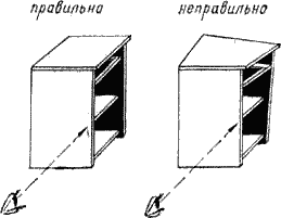 Теперь убедитесь, что задние кромки всех соединенных деталей находятся в одной плоскости (рис. 30, а), а передние кромки боковых стенок взаимно параллельны. Для этого достаточно посмотреть на собранный предмет сбоку (рис. 30, б). Параллельность кромок – очень важное требование. При несоблюдении его невозможно правильно навесить дверки, так как они окажутся в разных плоскостях, то есть будут перекошены.