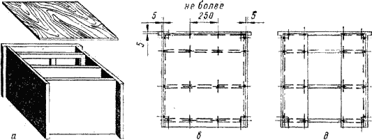 Если не удастся приобрести фанерный лист достаточных для задней стенки размеров, не огорчайтесь. Вместо сплошной задней стенки можно установить две краевые фанерные полосы, связывающие боковые стенки с днищем и крышкой (рис. 31, д). Прочность и жесткость при этом достигаются такие же, как и при сплошной стенке, а материала идет меньше. Отсутствие же задней стенки у стола-шкафа (при наличии связующих полос) в принципе допустимо, поскольку ее роль может выполнять сама стена, вплотную к которой ставится стол.